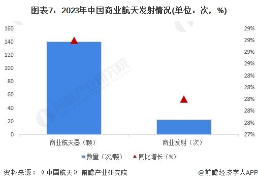 在国家政策的大力扶持下,我国商业航天活动日益活跃,商业发射次数呈现出高速增长的态势。2023年,我国发射商业航天器141颗,同比增长29%;商业发射23次,较2022年增长28%。