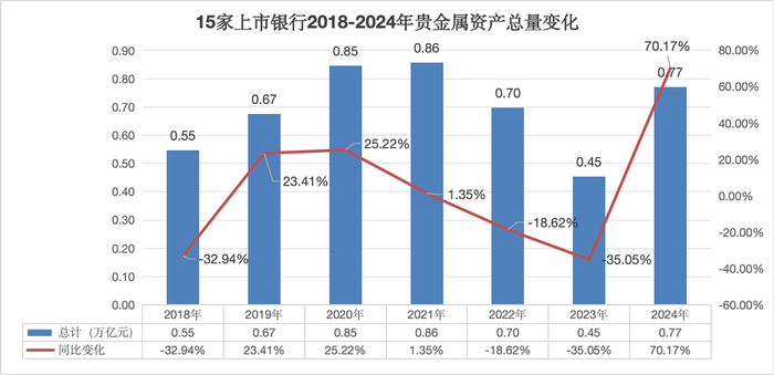 如今黄金交易的价量齐升,已推动银行业贵金属资产规模迎来低点后的强势增长。2024年已披露数据的15家上市银行年末贵金属规模较年初增长超7成,创下了2018年以来的增幅高峰;