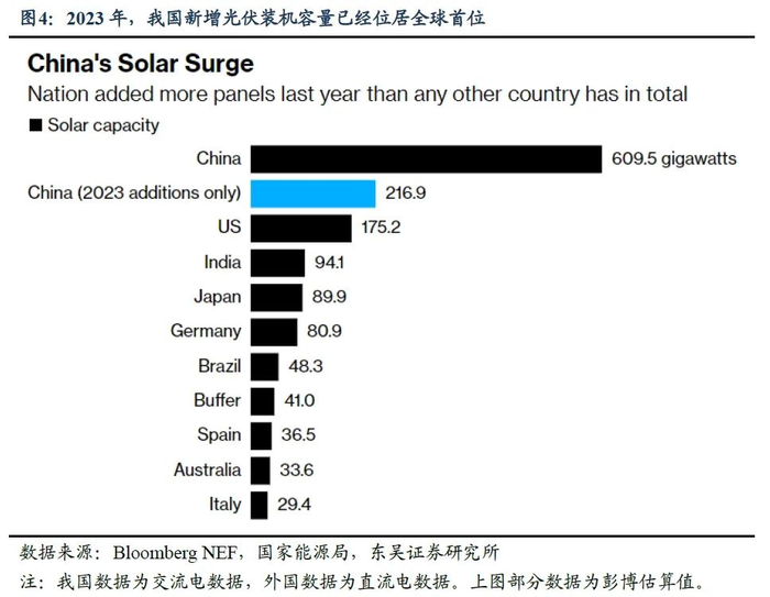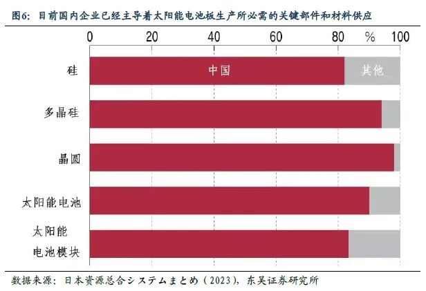 第三,在光伏发电行业,2023年我国新增光伏装机容量已经位居全球首位。而参考日本研究机构统计,目前我国企业在太阳能电池制造以及硅片、多晶硅、金属硅等前期环节的市场份额均超过80%,中国企业已然主导着太阳能电池板生产所必需的关键部件和材料的供应。