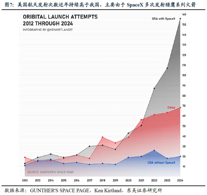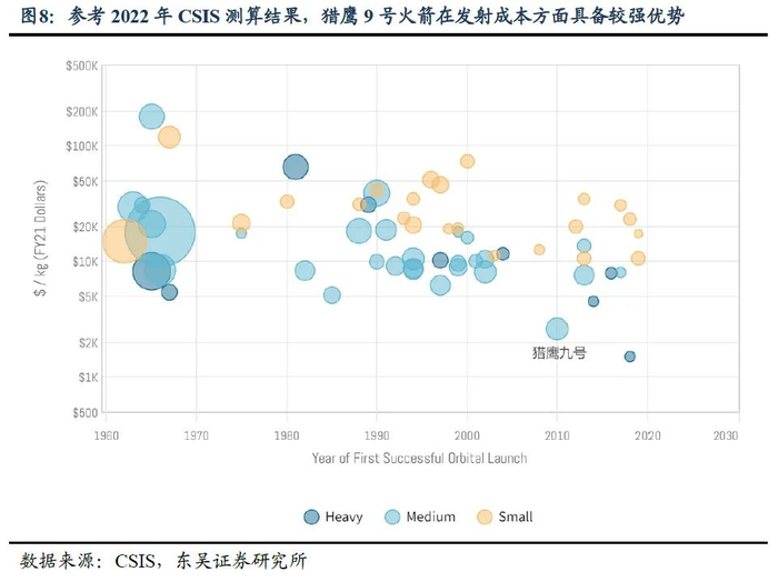 参考GUNTHER'S SPACE PAGE数据统计,近年来,美国火箭发射次数明显超过我国,主要由于Space X旗下猎鹰9号等火箭发射次数较多。参考CSIS在2022年的相关估算数据,与国内长征系列相比,猎鹰9号在单位重量的运输成本方面具备较为明显的成本优势,尤其是Space X目前正在攻关的火箭可回收重复利用技术一旦取得关键突破,相关发射成本优势或将进一步扩大。未来,我国在火箭发射成本、回收重复利用等方面或需进一步突破。