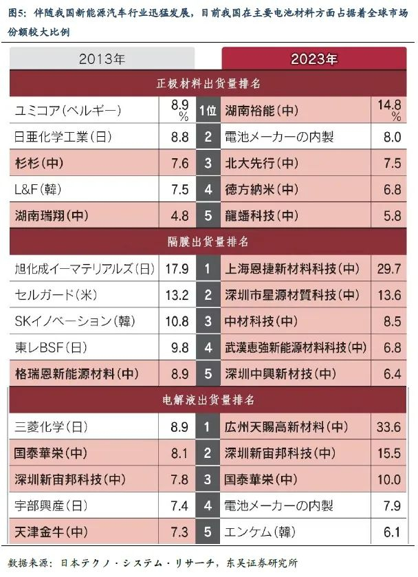 第四,在新材料行业,伴随我国新能源汽车行业的迅猛发展,目前我国在主要电池材料,如正极材料、隔膜、电解液等领域均占据着全球市场份额的较大比例。