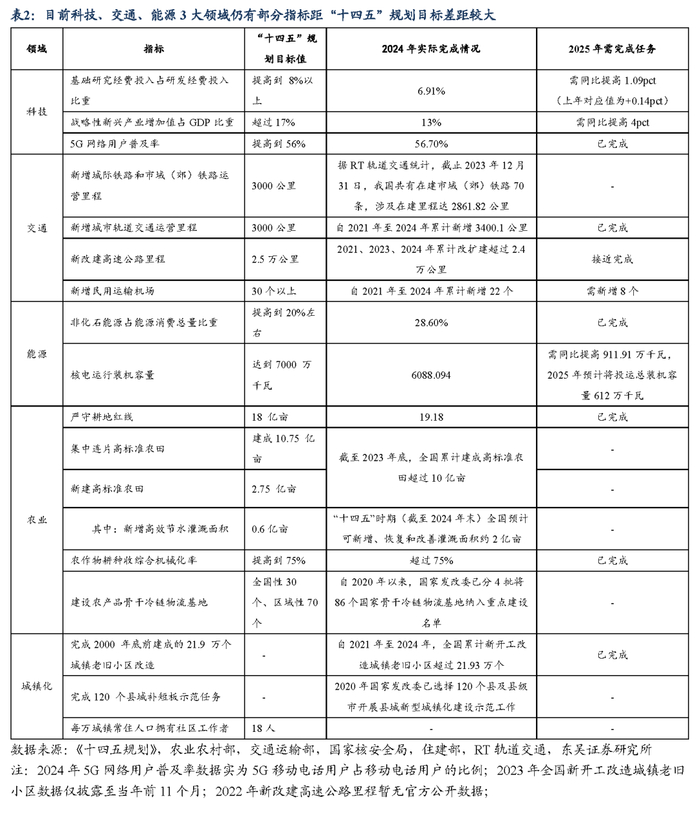 从细分领域发展目标看,加大基础研究经费投入与加快建设战略性新兴产业、新增民用运输机场、提高核电运行装机容量3个领域仍有较大发展压力。第一,在科技方面,根据《十四五规划》,到2025年全国基础研究经费投入占研发经费投入的比重需提高至8%以上,战略性新兴产业增加值占GDP比重需提高至17%以上。但参考2024年实际数据看,2025年全国基础研究经费投入占研发经费投入的比重需同比提高1.09个百分点,该数值明显高于2024年对应0.14个百分点的实际值;2025年战略性新兴产业增加值占GDP的比重需在2024年对应13%的基础上再提高至少4个百分点,上述2项指标的增长压力可能相对较大。