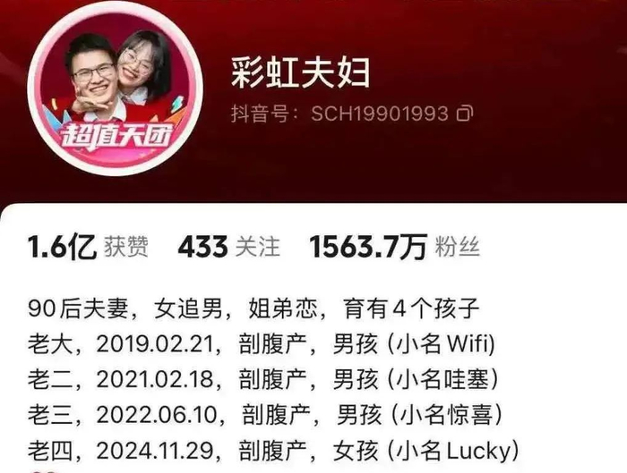 2024年11月29日,“彩虹夫妇”官宣产女喜讯,并表示“如愿了,从此封肚,不再生了。”她透露,由于5年剖4胎,身体情况不太好,家人在产房外等了3个小时。宣布产女后,12月1日,千万粉丝网红“彩虹夫妇”再发动态,称女儿被确诊为ABO溶血,但不少网友认为是联合炒作。