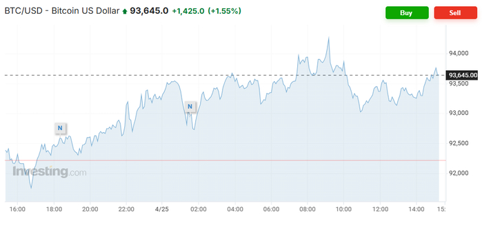 周五(4月25日)截止发稿,比特币上涨了1.55%至93,645美元。