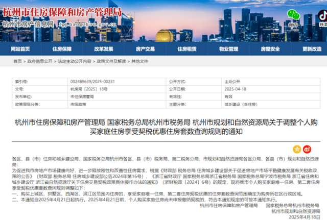 4月18日,杭州市住房保障和房产管理局、国家税务总局杭州市税务局、杭州市规划和自然资源局发布了《关于调整个人购买家庭住房享受契税优惠住房套数查询规则的通知》,对可享受首套及二套契税优惠的规则进行了调整。