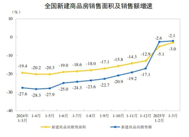 纵观一季度,全国房地产市场销售有所回暖。据国家统计局数据,一季度全国新建商品房销售面积同比下降3%,降幅比去年全年收窄9.9个百分点,比1—2月收窄2.1个百分点;全国新建商品房销售额同比下降2.1%,降幅比去年全年收窄15个百分点,比1—2月收窄0.5个百分点。