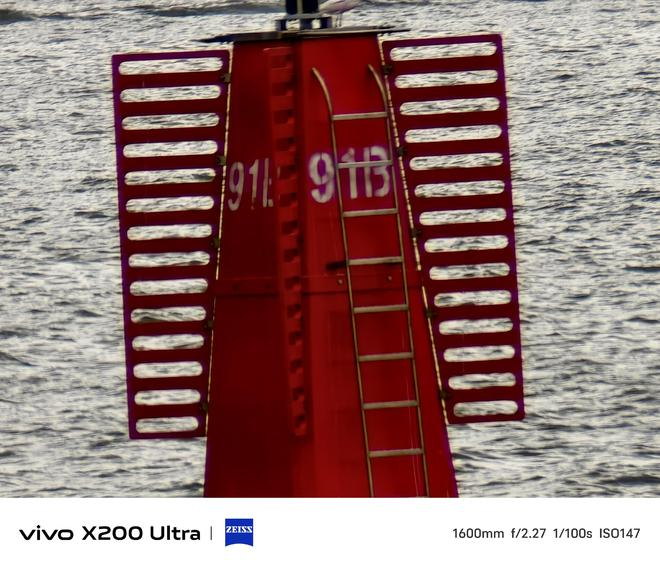 在 800mm 的情况下,虽说物体的背景已经出现了非常明显的算法和锐化痕迹,但被摄主体本身的细节保留相当完整,「91B」的字样清晰可见。