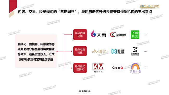 这些机构在发展过程中,不仅拓展了电商业务、入驻不同平台、进军多元内容领域,还开始建设自有品牌、拓展海外业务。