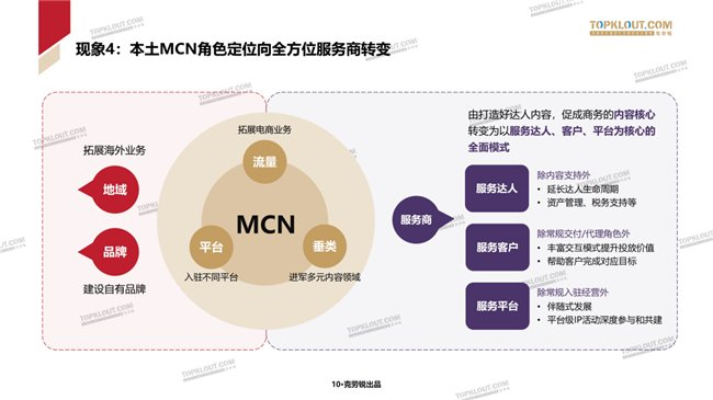 与此同时,有相当一部分MCN机构开始从“打造好达人内容,促成商务”的内容核心向“以服务达人、客户、平台”为核心的服务商模式演进。