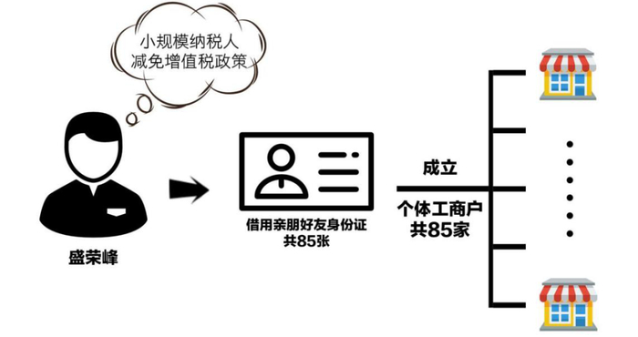 他借用了亲戚、朋友的85张身份证,成立了85家个体工商户,除前期为某纸业公司补开发票外,后期开票金额均控制在每家每季度不超过30万元增值税起征点,借此达到享受增值税小规模纳税人减免政策优惠,逃避缴纳税款的目的。