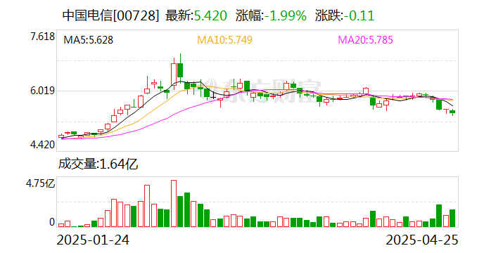 中国电信公告,2025年第一季度营收为1345.09亿元,同比增长0.01%;归属于上市公司股东的净利润为88.64亿元,同比增长3.11%。