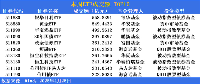 成交额方面,银华日利ETF(511880)周成交额达558.84亿元,位居榜首。黄金ETF(518880)、华宝添益ETF(511990)ETF(511520)成交额分别为549.44亿与492.56亿紧随其后。