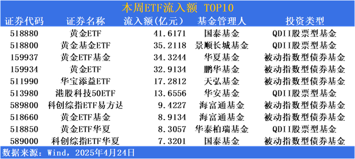 具体资金流入方面,本期(2025年4月21日-4月24日)内,资金继续追捧黄金ETF,多只黄金ETF资金净流入居前,黄金ETF(518880)本期流入超40亿,黄金基金ETF(518800)、黄金ETF基金(159937)等流入超30亿。