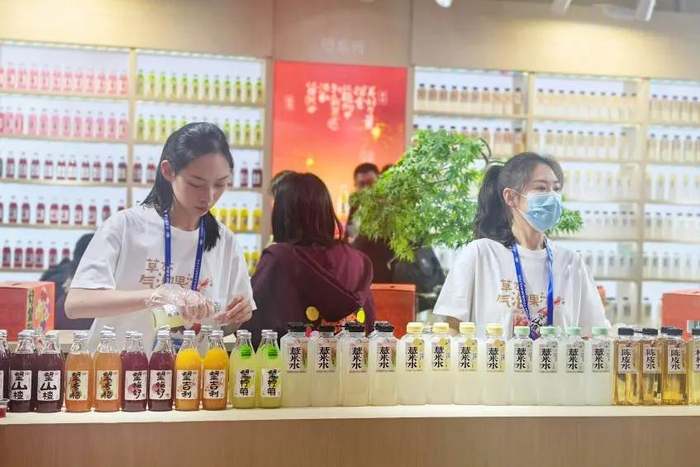 2025年3月25日,四川成都第112届全国糖酒商品交易会上展示的新中式茶饮。新华社记者 李倩薇 摄