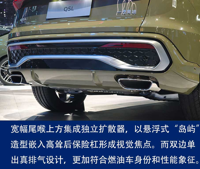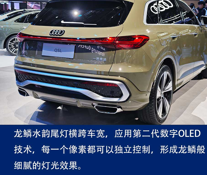 据介绍,全新奥迪Q5L搭载第二代数字OLED尾灯,可实现车辆与周围环境的通信交互(car-to-X车联网),如在后车快速接近时,尾灯会自动显示三角警告标志,提醒注意安全。此外,搭载中国市场专属的quattro高位刹车灯,当踩下刹车时“quattro”图案会投射到后车窗上,呈现更加醒目的视觉效果。