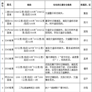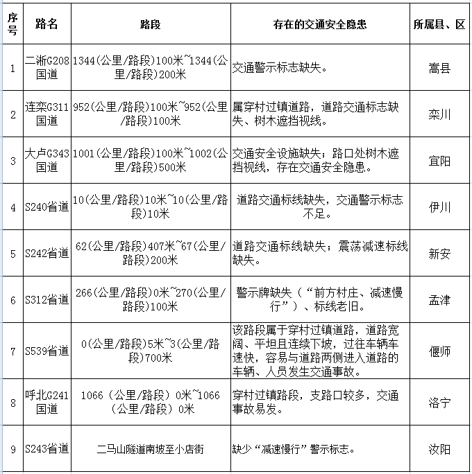 2、高速公路事故易发路段;二广高速K1132至K1139双幅(吉利孟州站至连霍高速互通之间),宁洛高速K717至K697双幅(宁洛高速汝阳、伊川段),宁洛高速K719至K728(宁洛高速彭婆互通立交至宁洛高速洛栾高速互通立交)。