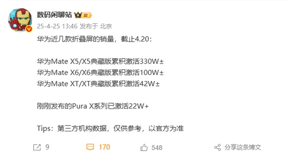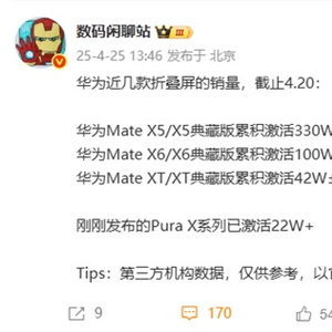 据了解,截至4月20日,华为Mate X5/X5典藏版累计激活330万台左右,Mate X6/X6典藏版激活量为100万台左右,Mate XT/XT典藏版激活42万台左右。