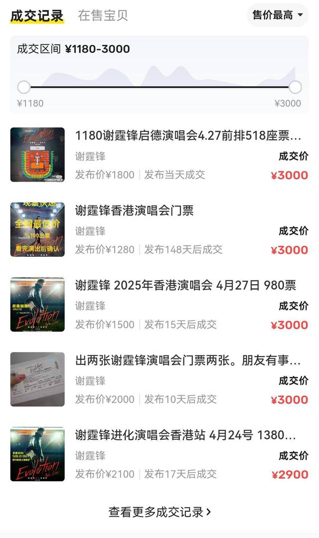 根据海报新闻24日晚间的报道,“曾有黄牛在网上放票,原价最高1380港元的门票在二手平台被炒到17万多人民币。英皇老板杨受成透露就连谢霆锋的妈妈都没有他的演唱会门票。”公开资料显示,本次演唱会设四档票价,最高价为1380港元,约1281元人民币,17万人民币约18万港币,与原最高价相比涨价约130倍,这样的涨幅的确极为惊人。当前国内的二手交易平台上仍有谢霆锋香港演唱会门票出售,以闲鱼平台为例,闲鱼行情统计显示,近7日谢霆锋演唱会成交均价为1950元,二手成交价格最高峰大体出现在三月中下旬,成交均价在2600元,参考本场演唱会的最高票档,涨价约1倍左右。从成交记录上来看,最高成交价格为3000元。
