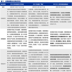 政策工具箱将呈现灵活性与超常规双重特征,会议提出“根据形势变化及时推出增量储备政策,加强超常规逆周期调节”。鉴于美国关税政策不确定性加剧对我国经济预测的扰动,叠加会议“强化底线思维,备足政策预案”的要求,预计后续政策将密切跟踪高频经济数据边际变化,在波动窗口期适时加大调节力度,确保经济运行在合理区间。