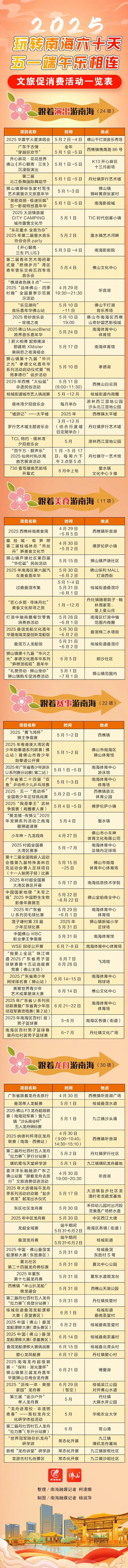 聚焦五一、端午两个假期时间节点,南海区对四大主题活动进行再策划、再创新,正式发布2025年“玩转南海六十天,五一端午乐相连”文旅促消费活动。