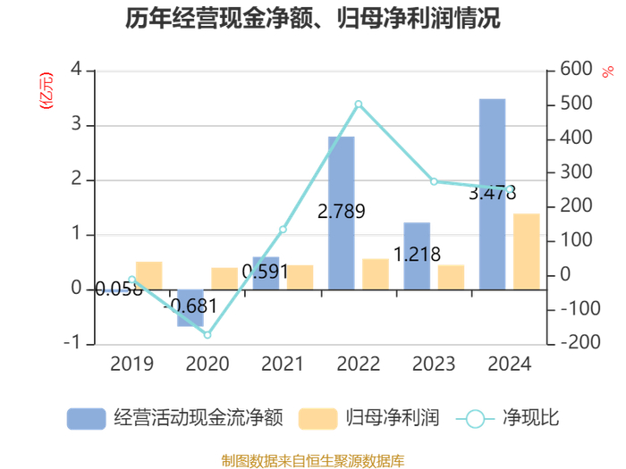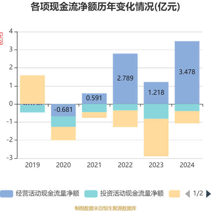 截至2024年,公司经营活动现金流净额为3.48亿元,同比增长185.41%;筹资活动现金流净额-6806.62万元,同比增加1.4亿元;投资活动现金流净额-3918.49万元,上年同期为-8178.6万元。