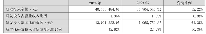 2024年全年,公司研发投入金额为4013.35万元,同比增长12.22%;研发投入占营业收入比例为1.95%,相比上年同期上升0.32个百分点。此外,公司全年研发投入资本化率为32.62%。