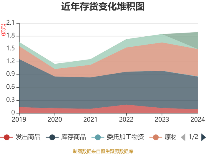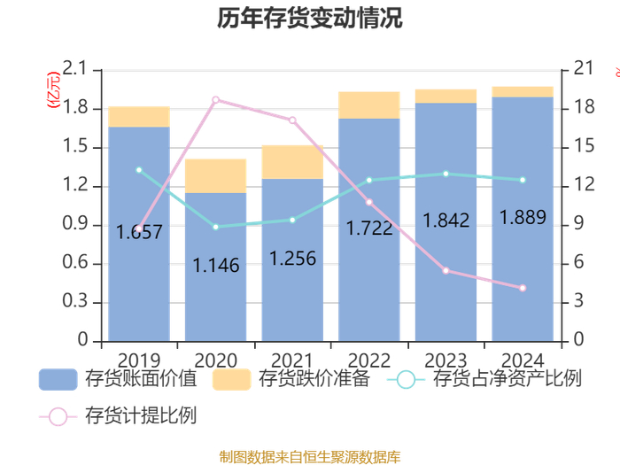 从存货变动来看,截至2024年末,公司存货账面价值为1.89亿元,占净资产的12.47%,较上年末增加471.73万元。其中,存货跌价准备为807.44万元,计提比例为4.1%。