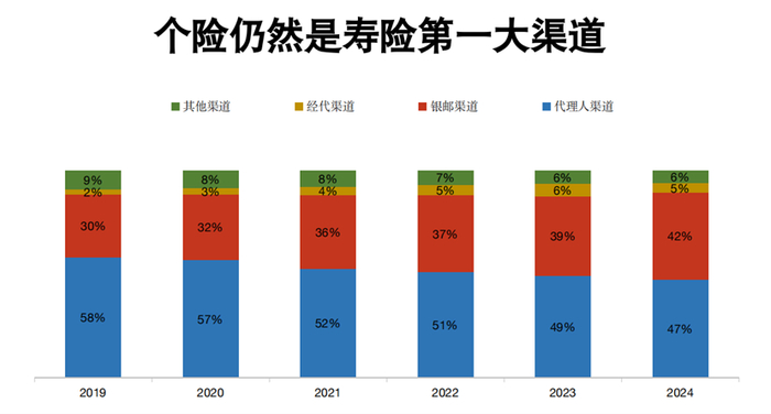 虽然,近年来个险人力规模大幅缩减。根据《2024中国保险中介市场生态白皮书》数据,截至2023年年末,人身险公司保险营销员人数仅为281万人,与2019年高峰时期的912万人相比,缩水比例接近70%。但是作为保险营销的主要渠道之一,个险依旧是寿险的第一大渠道。保通社了解到,2024年,个险保费收入近2万亿元,增长6.45%,个险渠道业务占比达到47%。