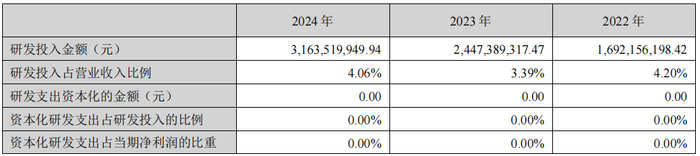 2024年,阳光电源研发投入31.63亿元,占营业收入的4.06%。无研发支出资本化支出。