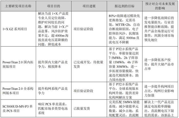 研发内容包括PowerTitan 2.0 国内拓展版项目,基于PT2.0 系统产品平台,单箱容量达到7.5MWh,2h子阵容量15MWh,4h子阵容量 30MWh,进一步拓展容量极限,快速迭代极致降本。项目已完成开发,待批量发货。