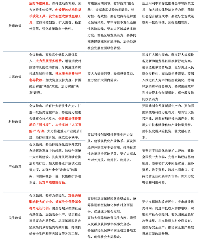 会议指出,“要不断完善稳就业稳经济的政策工具箱,既定政策早出台早见效,根据形势变化及时推出增量储备政策,加强超常规逆周期调节,全力巩固经济发展和社会稳定的基本面。”此前2024年12月政治局会议首次明确提出“加强超常规逆周期调节”,本次会议再次提及超常规逆周期调节,表明政策加码的力度和决心,进一步凸显政策框架的延续和升级。会议提出的“超常规逆周期调节”,不仅仅是简单的政策力度加码,更注重结构性引导与长期韧性培育的结合,聚焦“新质生产力”、“人工智能+”等战略领域。在当前美国掀起贸易战,外部发展环境压力较大的背景下,增量政策特别是内需政策加码加力,对于稳定市场信心和拉动宏观经济发展都具有重要意义,将逆周期调节与结构性改革深度融合,体现了中央政府的积极有为主动应对挑战。此外,会议提出“既定政策早出台早见效”“及时推出增量储备政策”,表明政策应对逻辑从被动储备转向主动发力抢跑。会议强调“全力巩固经济发展和社会稳定的基本面”,既包括短期稳定资本市场、保就业,也涵盖新质生产力培育、金融市场建设等长期任务。