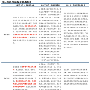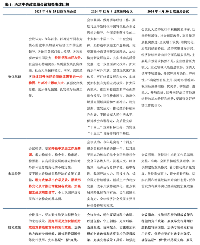4月政治局会议有六大亮点:一是充分认识关税冲击,明确指出“斗争”要求,积极应对外部不确定性。二是重提超常规逆周期调节,凸显政策力度和决心。三是货币政策显著发力,新设政策性金融工具和服务消费与养老再贷款。四是大力发展服务消费,表述由扩大服务消费调整为大力发展服务消费。五是再现活跃资本市场,“稳定”变“活跃”,政策呵护力度有望加强。六是地产政策仍显克制,坚持高质量发展与新发展模式。