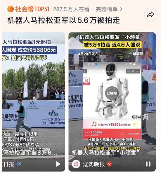 据悉,在机器人半马比赛结束当天,小顽童队的明星选手——身高1.2米的松延动力N2机器人迅速成为了焦点。这款机器人不仅在赛场上展现出了出色的稳定性和灵活性,更在赛后在京东拍卖平台上以1元的价格起拍,吸引了近4万人围观,经过激烈的竞拍比拼,最终以56806元的价格成功拍出,引发了全网的广泛讨论。