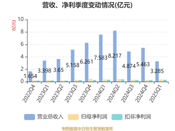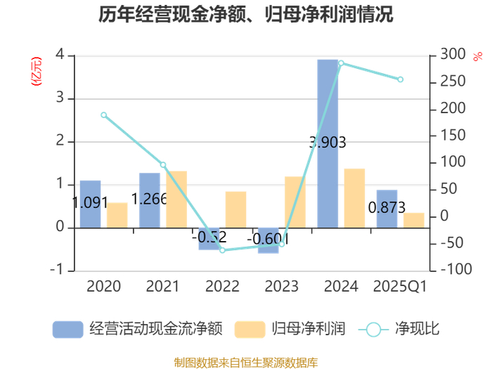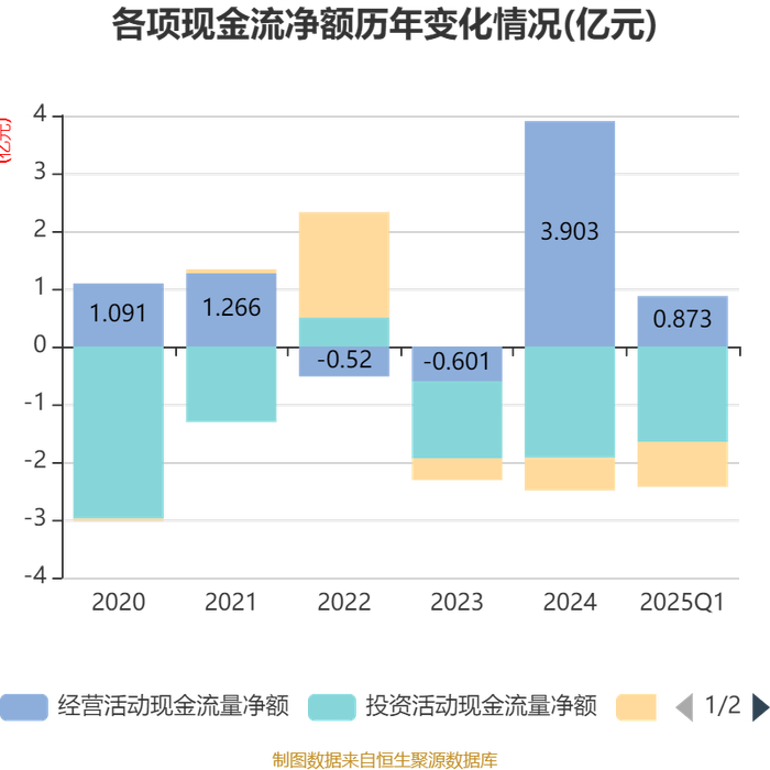 截至2025年一季度末,公司经营活动现金流净额为8733.74万元,同比增加1.1亿元;筹资活动现金流净额-7798.74万元,同比减少1.55亿元;投资活动现金流净额-1.65亿元,上年同期为140.74万元。