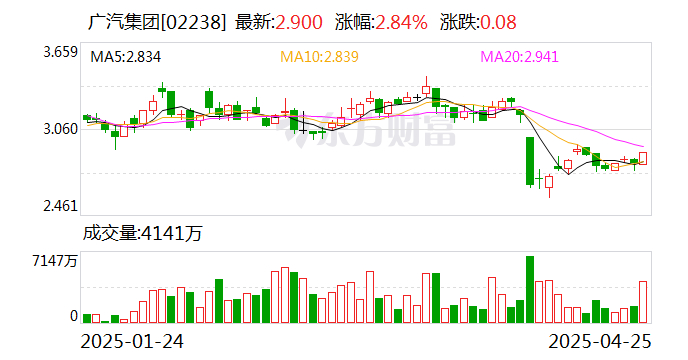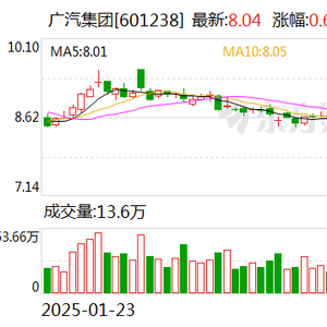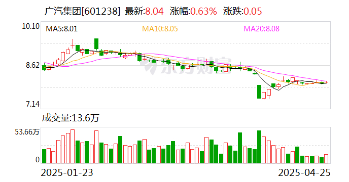 25日收盘,广汽集团涨0.63%,报收于8.04元/股。