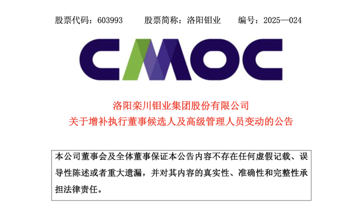 4月25日晚间,洛阳钼业公告多位高管变动。公司董事长袁宏林,公司副董事长、首席投资官李朝春辞任,增补阙朝阳、刘建锋进入董事会,同时任命四位新高管:阙朝阳任常务副总裁兼首席运营官、刘建锋任首席投资官、Kenny Ives任副总裁兼首席商务官、谭啸任副总裁。