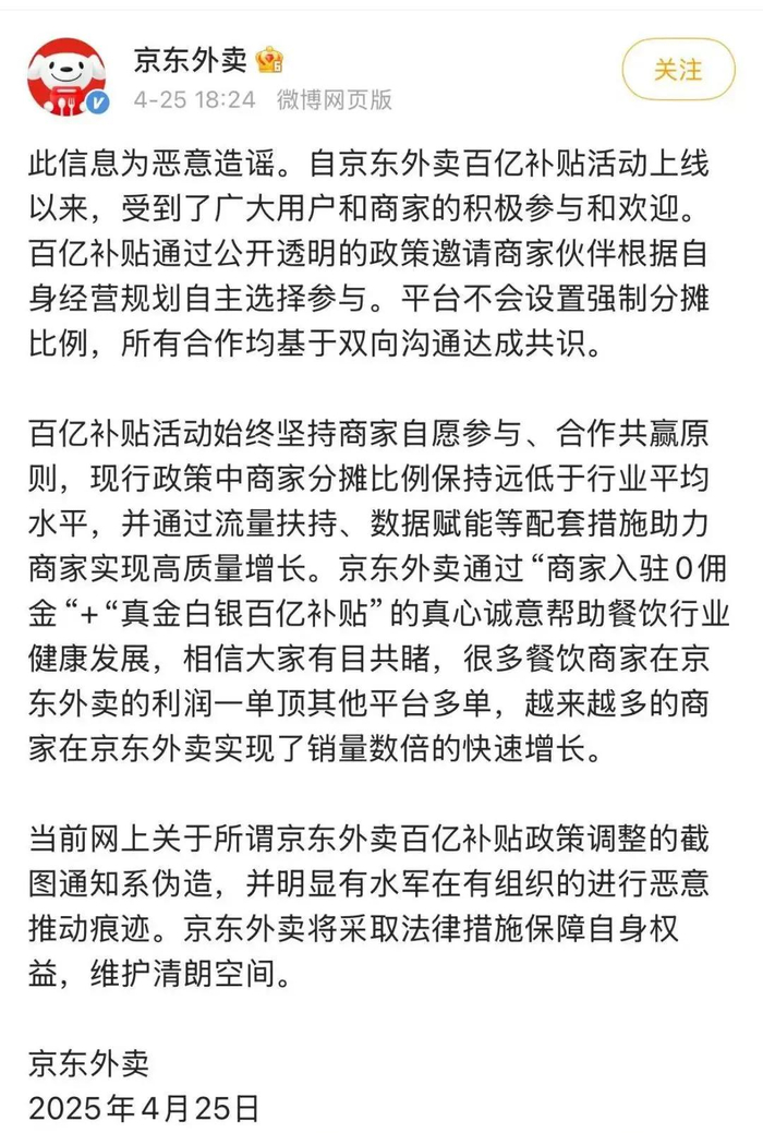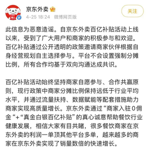4月25日,针对部分媒体报道“京东外卖百亿补贴要求商家承担50%”一事,京东外卖回应称,此信息为恶意造谣。百亿补贴通过公开透明的政策邀请商家伙伴根据自身经营规划自主选择参与。平台不会设置强制分摊比例,所有合作均基于双向沟通达成共识。