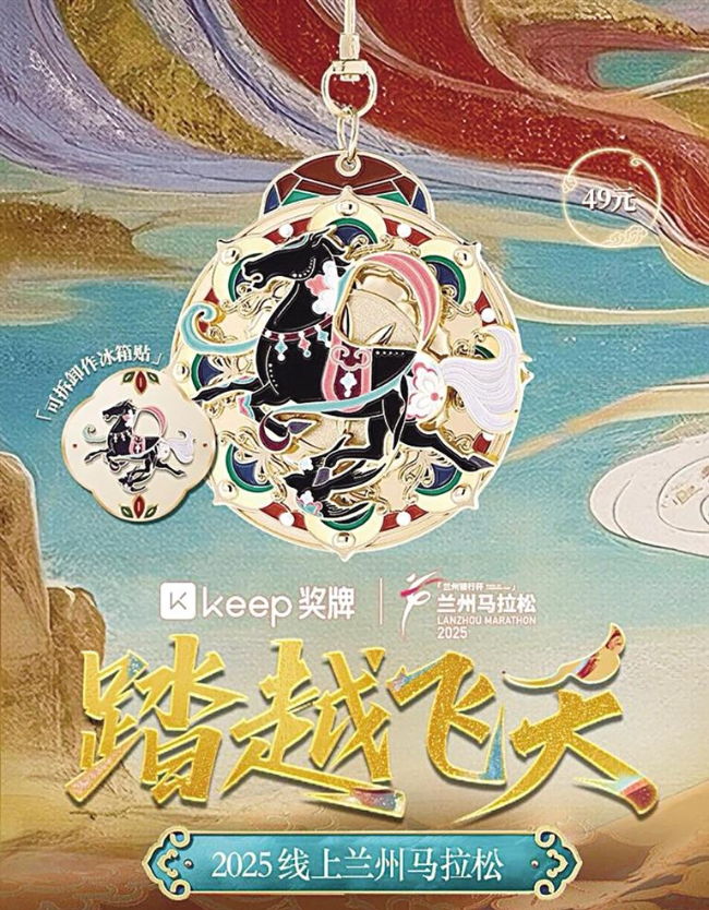 记者看到,兰马线上赛“踏跃飞天奖牌”采用立体凸起结构,以“马踏飞燕”为核心元素,采用立体凸起结构。背景层叠西域壁画中的圣莲图腾。奖牌将西域地区独特的历史文化和视觉美学巧妙地结合在一起,既有马蹄踏破云霞的壮阔,也蕴含千年的文化与故事。