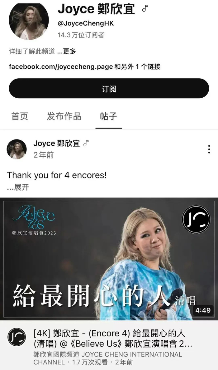 4月24日,有网友发现郑少秋、沈殿霞的女儿,香港艺人郑欣宜突然清空社交网站内容,其YouTube频道的Vlog也悉数下架,仅保留少量帖文与专辑歌曲,最近一条视频系两年前发布的演唱会内容,而她的微博更新停留在了2020年。