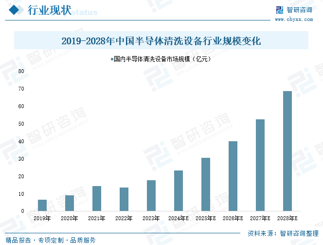 此外,为了进一步提高集成电路性能,芯片结构开始3D化,此时清洗设备在清洗晶圆表面的基础上,还需在无损情况下清洗内部污染物,这对清洗设备提出了更高的技术要求。芯片工艺的进步及芯片结构的复杂化导致清洗设备的价值持续提升。综上分析,近年来,在国内半导体行业快速发展趋势的推动下,我国已经成为全球半导体设备第一大市场,全国半导体清洁设备市场规模加速扩容,产业发展前景日益广阔。数据显示,2023年,我国半导体清洗设备市场规模已从2019年的6.46亿元增长至17.77亿元;根据市场预测,2028年国内半导体清洗设备市场规模有望增长至68.58亿元。