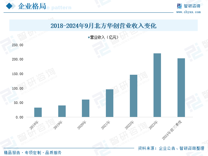 北方华创科技集团股份有限公司成立于2001年9月,2010年在深圳证券交易所上市,股票简称“北方华创”。北方华创专注于半导体基础产品的研发、生产、销售和技术服务,主要产品为电子工艺装备和电子元器件,是目前国内集成电路高端工艺装备的先进企业。在半导体装备业务板块,北方华创的主要产品包括刻蚀、薄膜沉积、炉管、清洗、快速退火、晶体生长等核心工艺装备,广泛应用于集成电路、功率半导体、三维集成和先进封装、化合物半导体、新型显示、新能源光伏、衬底材料等制造领域。数据显示,2024年前三季度,北方华创营业收入为203.53亿元,同比增长39.51%。