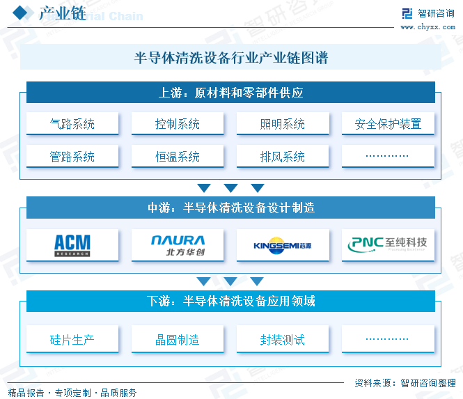 半导体清洗设备行业产业链上游为原材料和零部件,包括气路系统、控制系统、照明系统、安全保护装置等关键零部件和系统的供应。产业链中游为半导体清洗设备的设计制造环节,代表厂商有泛林半导体(LRCX)、泰科电子(TEL)、盛美上海、北方华创、芯源微、至纯科技等。产业链下游为半导体清洗设备应用环节,主要应用于硅片生产、晶圆制造、封装测试等半导体行业制造环节。