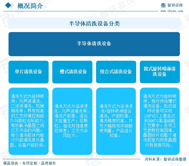 在湿法清洗工艺路线下,目前主流的清洗设备主要包括单片清洗设备、槽式 清洗设备、组合式清洗设备和批式旋转喷淋清洗设备等,其中单片清洗设备市场 份额占比最高。湿法清洗工艺路线下主流的清洗设备存在先进程度的区分,主要 体现在可清洗颗粒大小,金属污染,腐蚀均一性以及干燥技术等标准。半导体清洗设备行业按照清洗方式不同,可分为单片清洗设备、槽式清洗设备、组合式清洗设备和批式旋转喷淋清洗设备。