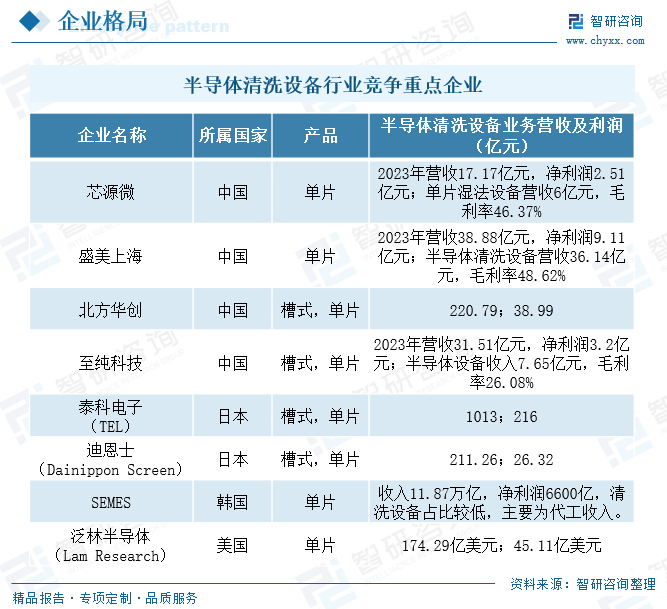 目前,全球半导体清洗设备市场集中度较高,海外厂商占据主导地位。然而,随着国内企业核心技术和工艺能力的提升,以及在客户认证方面的不断进展,国产半导体清洗设备有望在未来实现显著的市场替代。国内政策环境也为半导体及显示面板产业的发展提供了良好的支持,进一步推动了半导体清洗设备行业的国产替代进程。