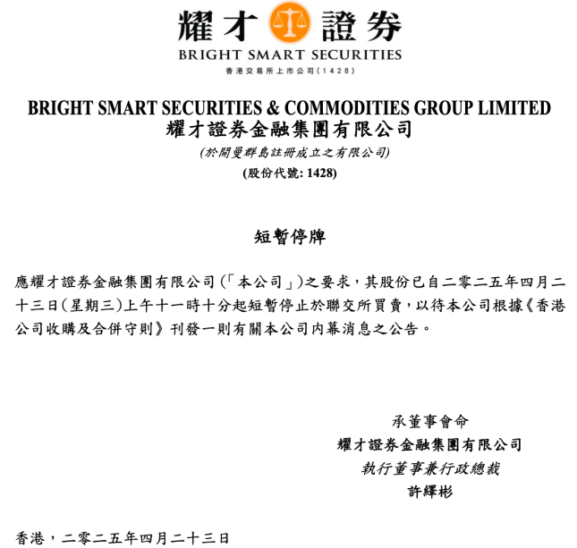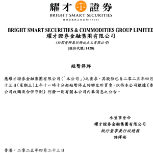 4月23日,耀才证券股价急升9.32%后停牌,股价报收于3.05港元/股。随后耀才证券公告称,将刊发一则内幕消息公告,因此自当天上午11时10分起停牌。