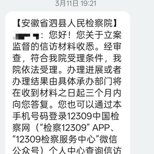 她告诉澎湃新闻,今年3月份,她向泗县检察院递交了一份申请立案监督的材料。3月11日,泗县检察院通过短信回复称,经审查,符合该院受理条件,已依法受理;3月26日,泗县检察院再次发短信通知,已转由该院第一检察部办理,该案件进展及办理结果将于三个月内答复;3月28日,泗县公安局信访室回复表示,关于其要求公安机关立案侦查问题,已移送刑侦大队按照法律程序处理。