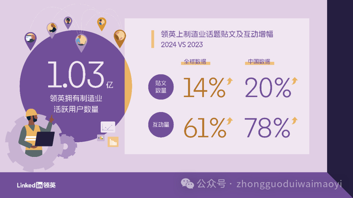 价值一:全漏斗受众触达。领英报告显示,制造业决策链日益复杂,企业需提升识别与触达全漏斗受众的能力,包括目标客户、关键决策者、KOL、潜在人才,以及有影响力的行业伙伴。而领英拥有1.03亿制造业用户,490万制造业企业,2024年领英上制造业话题贴文的数量较2023年增加14%,互动量增长61%;而中国制造业企业在领英上发布的贴文数量较2023年同比增长了20%,互动量增长更是高达78%。这表明制造业企业正日益依赖领英这样的全球化平台获取行业洞察与商业人脉,其中欧洲制造业企业决策者更是将领英视为获取市场研究信息的首选平台,比第二名的社交平台使用率高出104%。