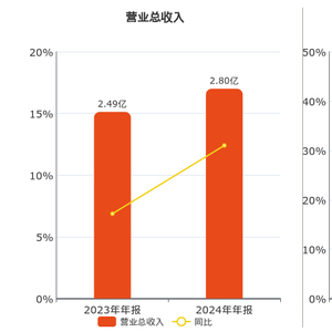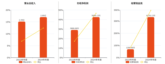 公司营业总收入为2.80亿元,在已披露的同业公司中排名第26。归母净利润为5699.13万元,在已披露的同业公司中排名第15。经营活动现金净流入为6276.13万元,在已披露的同业公司中排名第18。