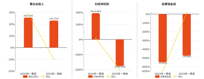 公司营业总收入为144.37亿元,较去年同报告期营业总收入减少16.07亿元,同比较去年同期下降10.01%。归母净利润为-3499.58万元,较去年同报告期归母净利润减少6914.04万元,同比较去年同期下降202.49%。经营活动现金净流入为-18.69亿元,较去年同报告期经营活动现金净流入增加2.96亿元。