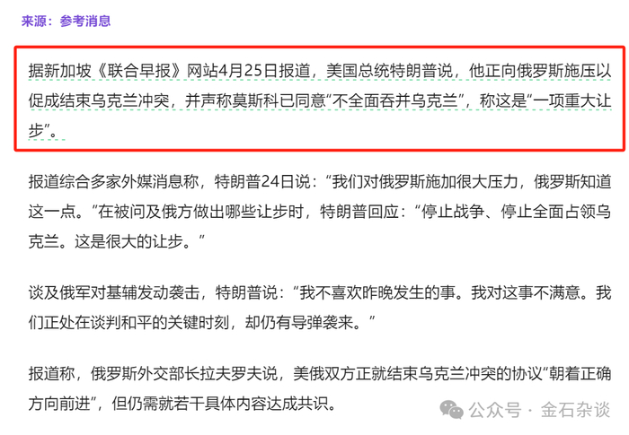 金石发现,特朗普发出惊人言论:据新加坡《联合早报》网站4月25日报道,美国总统特朗普说,他正向俄罗斯施压以促成结束乌克兰冲突,并声称莫斯科已同意“不全面吞并乌克兰”,称这是“一项重大让步”。